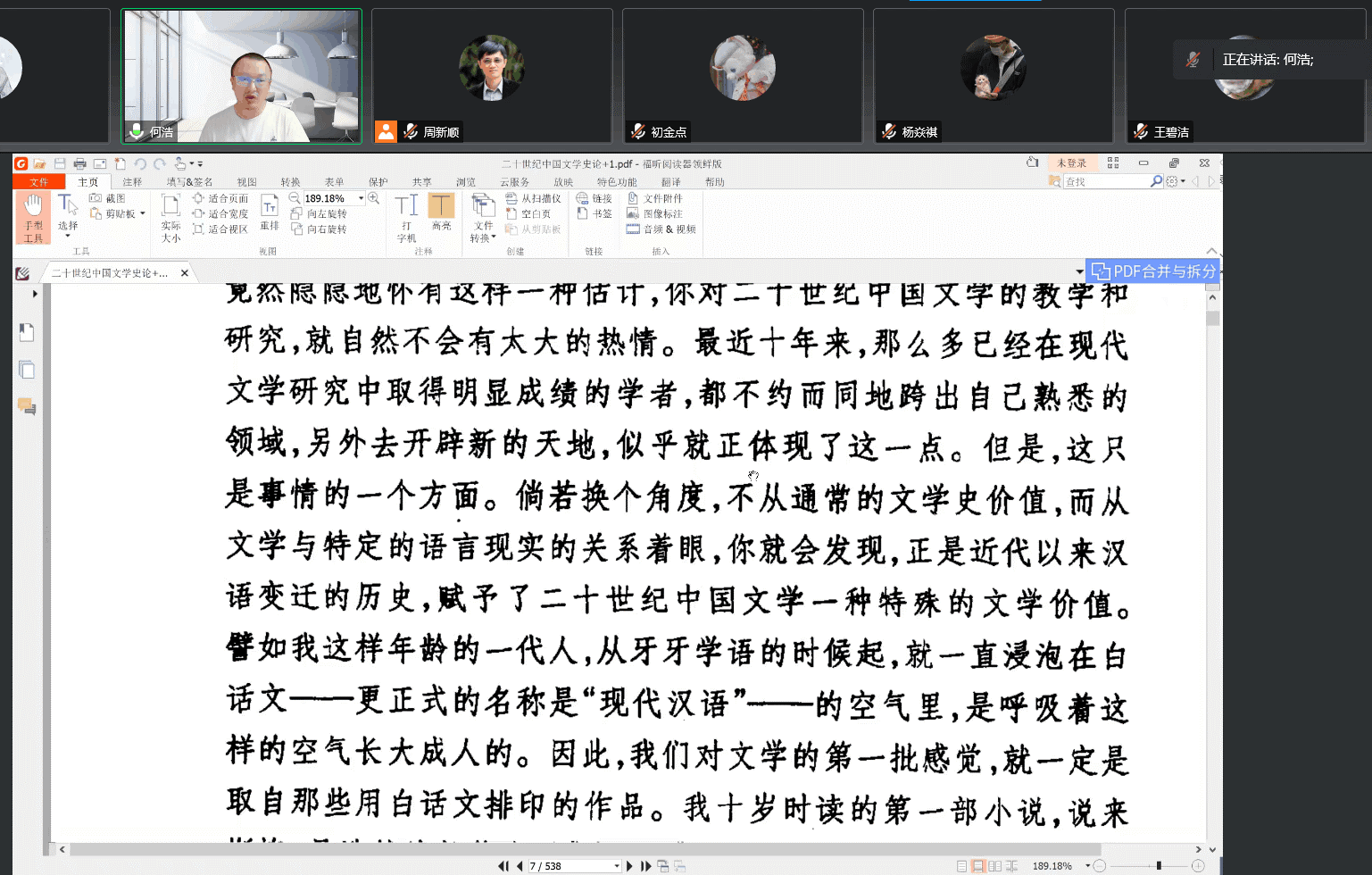 何浩研究员从王晓明《二十世纪中国文学史论》序言切入,引发出有关二十世纪中国文学的独特价值与学科地位的思考。他认可王晓明关于二十世纪中国文学作为一种现代汉语文学像一副“眼镜”一样为我们提供了最初文学经验的说法,他认为这副“眼镜”不仅决定了我们基本的文学趣味,甚至塑造了我们看世界的基本方式以及基本的生活、情感和思维方式,二十世纪中国文学的独特性、重要性和复杂性也正体现于此。在此基础上,何浩研究员以王安忆《分母》为例,提出二十世纪中国文学及其研究应该更多关注中国人当下的个体生存感悟和生命感悟,告别“生活在别处”,从回到“当下即是”的意义上去实现文学作为“人文学”的真正价值,并启发大家从这一角度去对文学与社会、人生的结合进行更深入地探讨。最后,何浩研究员还对现场师生的提问进行了详细解答。