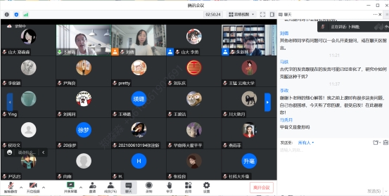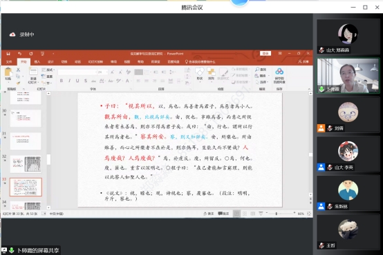 朱新林老师对卜师霞教授的精彩报告表示感谢,并进行总结。在提问环节,朱新林老师就概括义与核心义之间的关系、词的本义等问题与卜老师展开交流讨论。随后,多位同学也就《说文解字》对现代生活的启示、《说文解字》中的本义与甲骨文字形所反映的字义的差异、一些诗词中的具体语词如何理解等问题向卜老师提问。卜老师耐心细致地解答了问题,并推荐了可供参考的书目。11时40分左右,在参与师生纷纷向卜老师表示感谢后,讲座圆满结束。