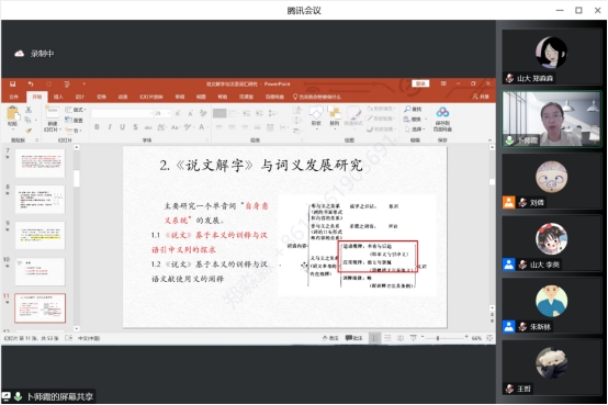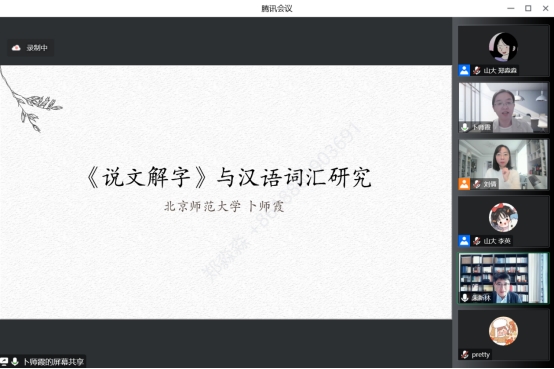 12月4日上午9时,北京师范大学卜师霞教授应十大信誉官网刘倩老师的邀请,做客十大信誉官网名师大讲堂,以腾讯会议为平台为校区师生作出题为“《说文解字》与汉语词汇研究”的学术报告。讲座由朱新林老师主持,除本校师生外,还有来自四川大学、武汉大学、中国社会科学院等其他院校的近百名师生参与本次活动。