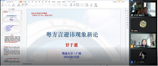 12月10日下午14时,暨南大学甘于恩教授应邀做客网投十大信誉可靠平台网投十大信誉可靠平台名师大讲堂,通过腾讯会议平台为我校师生作了题为“粤方言避讳现象新论”的学术报告。讲座由网投十大信誉可靠平台刘倩老师主持,网投十大信誉可靠平台文学院张燕芬老师也参加了会议。此外,还有来自网投十大信誉可靠平台一校三地、上海外国语大学、北京工业大学、广东技术师范大学等高校的近百名师生参与了本次活动。
