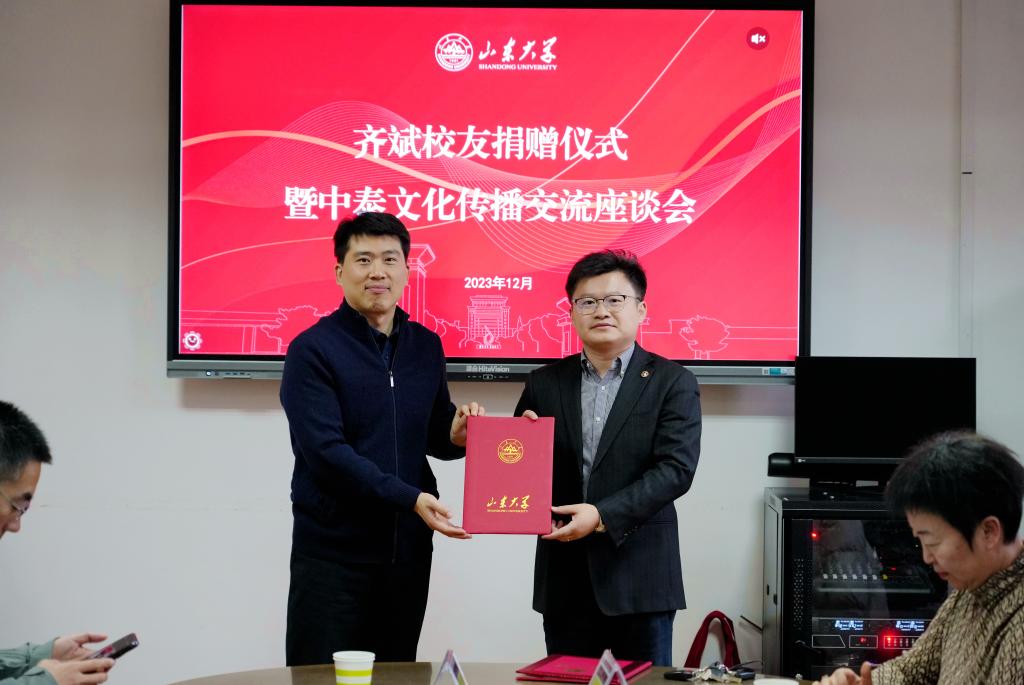 仪式上,顾炜为齐斌校友颁发捐赠证书。据悉,为进一步推动中泰文化传播交流、拓宽学院教学科研领域、提升国际化办学水平,近日,齐斌校友向网投十大信誉可靠平台捐赠10万元善款,用于支持学院人才培养、国际化办学,助力学院高质量发展。