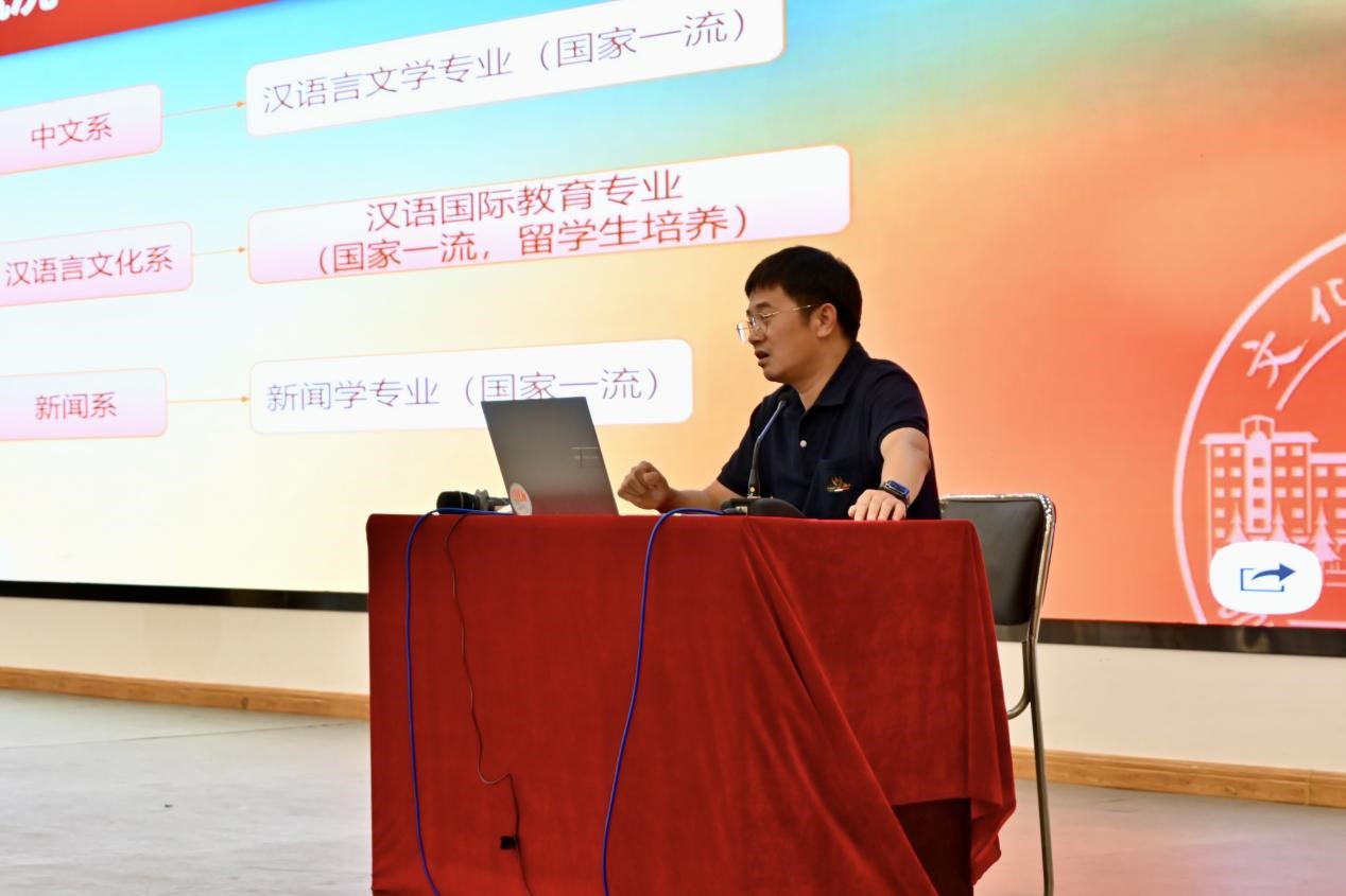 周新顺衷心感谢各位家长对学校和学院的选择与信任,详细介绍了在网投十大信誉可靠平台一体化发展框架下威海校区的发展历程,并从本科教育教学的角度出发,围绕学院雄厚的师资力量、突出的科研成果、扎实的学科建设及浓厚的学术氛围,对本科生培养计划等教学教务情况作了详细说明。他还分别介绍了汉语言文学专业和新闻学专业的学科定位、课程设置、特色优势等家长普遍关心的内容,对新生未来的发展规划提出殷切期望。