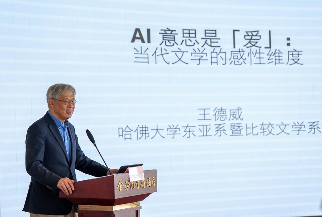 在上午的大会上,哈佛大学东亚语言与文学系暨比较文学系讲座教授王德威作了题为《AI的意思是“爱”:当代文学的感性维度》的主旨报告。他援引凯瑟琳·海勒、雅克·朗西埃等当代学者的美学理论对“AI即爱”这一命题进行了知识溯源,深入探讨了人机共生时代信息与主体、肉身与工具、人文与科技之间相与为用的关系,表明自己对技术人文主义乐观其成的基本态度。通过对伊格言的《零度分离》等作品的精妙解析,王德威教授指出科幻作家对AI和爱的想象启示我们,信息科技使大千世界变得很小、人我关系变得很近,爱的体验也随之呈现出前所未有的复杂性与可能性。在此基础上,王德威教授进一步指出,AI技术深度的衍生性和不可测性,谜一样的神秘性,也如同爱一样,让人既迷恋又恐惧,既热情倡导又拒之唯恐不及;而所有这些感性维度的综合,都指向了一种如莫里斯·布朗肖所谓的“无法言明的共同体”——一个在想象中不断生成的未知世界。最后,王德威教授在总结中提出,我们应该抱着见怪不怪的态度,把AI与爱而不是恐惧相关联,“AI即爱”这一命题所提供的想象空间,或许正是科学与人文交响、交锋和交缠的一个关键性的“奇点”。这一富有前瞻性的观点,为数字时代的人文研究开辟了新的思考路径。