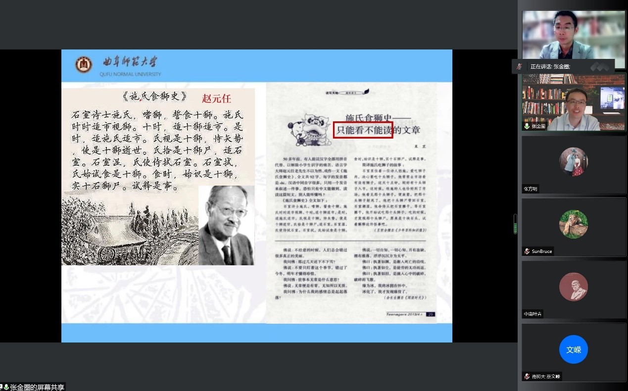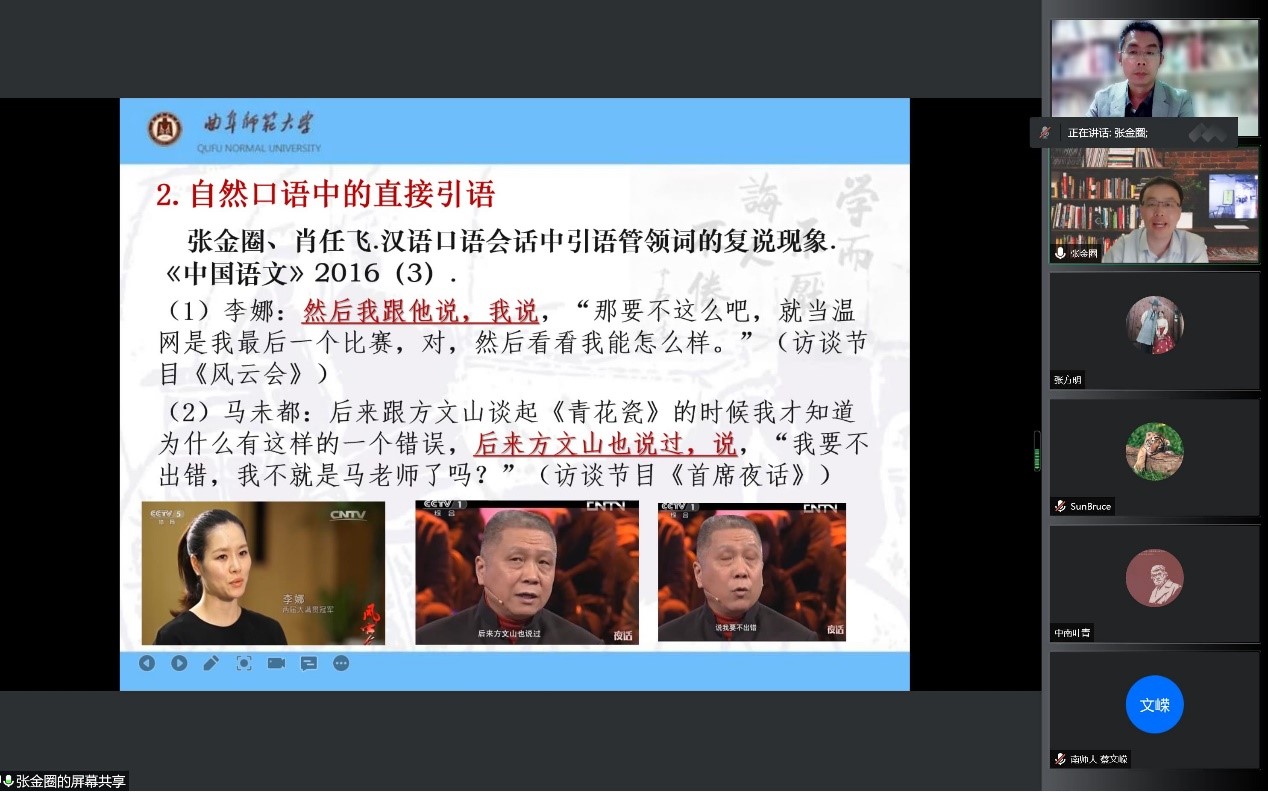 主讲人简介:张金圈,1983年生,师从著名语法学家储泽祥教授,获华中师范大学汉语言文字学专业博士学位,现为曲阜师范大学“杏坛学者”、教授,国际教育学院副院长,汉语言文字学和汉语国际教育专业硕士生导师。在《中国语文》《世界汉语教学》《汉语学报》《当代修辞学》《语言研究》《汉语学习》等语言学重要期刊发表学术论文30余篇,出版学术专著三部。主持国家社科基金项目、教育部人文社科项目和山东省社科规划项目各一项。获山东省社科优秀成果二等奖、济宁市社科优秀成果一等奖、曲阜师范大学青年教师教学比赛一等奖等教学科研奖励多项。主要研究方向为现代汉语语法和汉语国际教育。