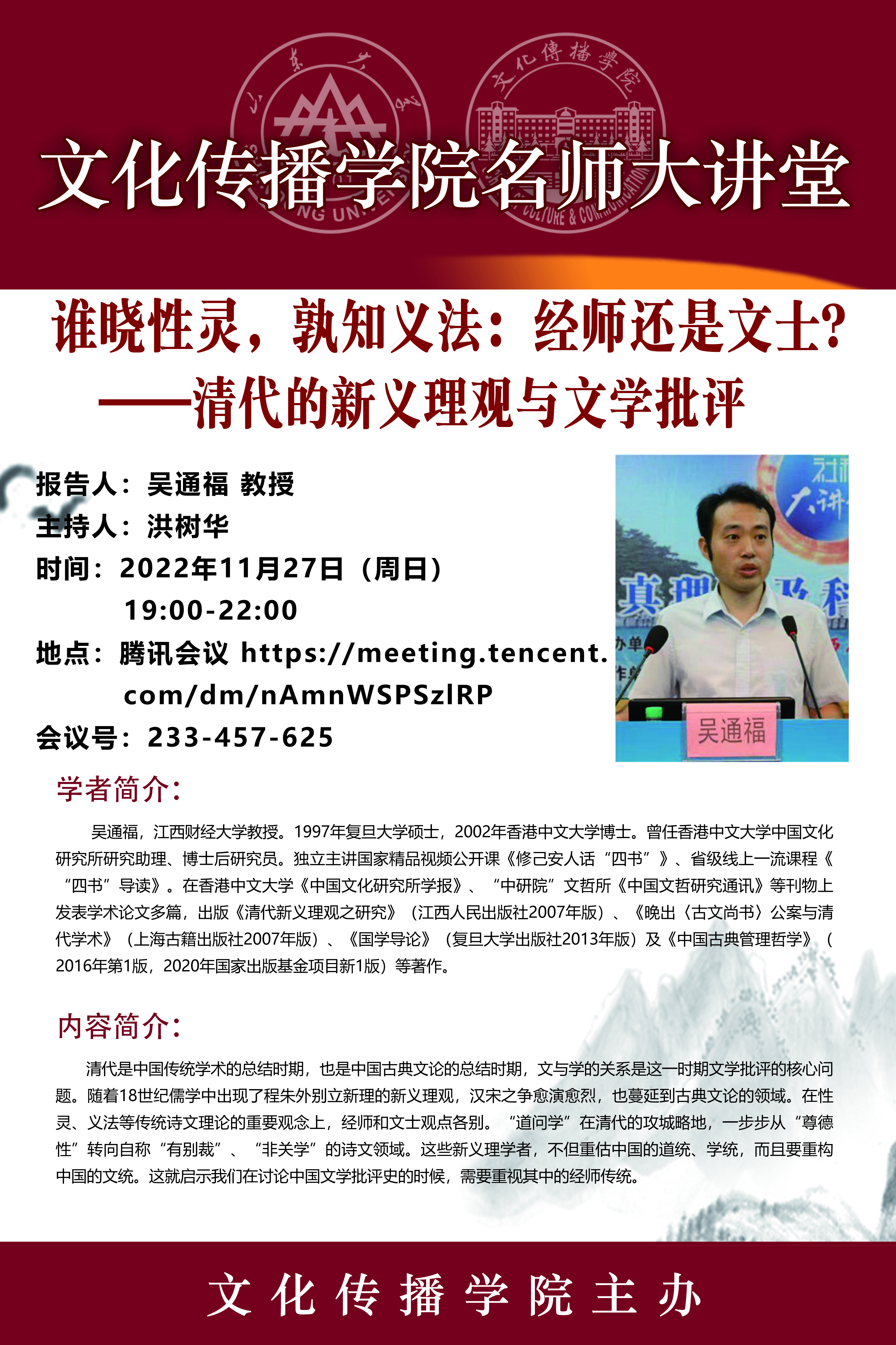 吴通福,江西财经大学教授。1997年复旦大学硕士,2002年香港中文大学博士。曾任香港中文大学中国文化研究所研究助理、博士后研究员。独立主讲国家精品视频公开课《修己安人话“四书”》、省级线上一流课程《“四书”导读》。在香港中文大学《中国文化研究所学报》、“中研院”文哲所《中国文哲研究通讯》等刊物上发表学术论文多篇,出版《清代新义理观之研究》(江西人民出版社2007年版)、《晚出〈古文尚书〉公案与清代学术》(上海古籍出版社2007年版)、《国学导论》(复旦大学出版社2013年版)及《中国古典管理哲学》(2016年第1版,2020年国家出版基金项目新1版)等著作。