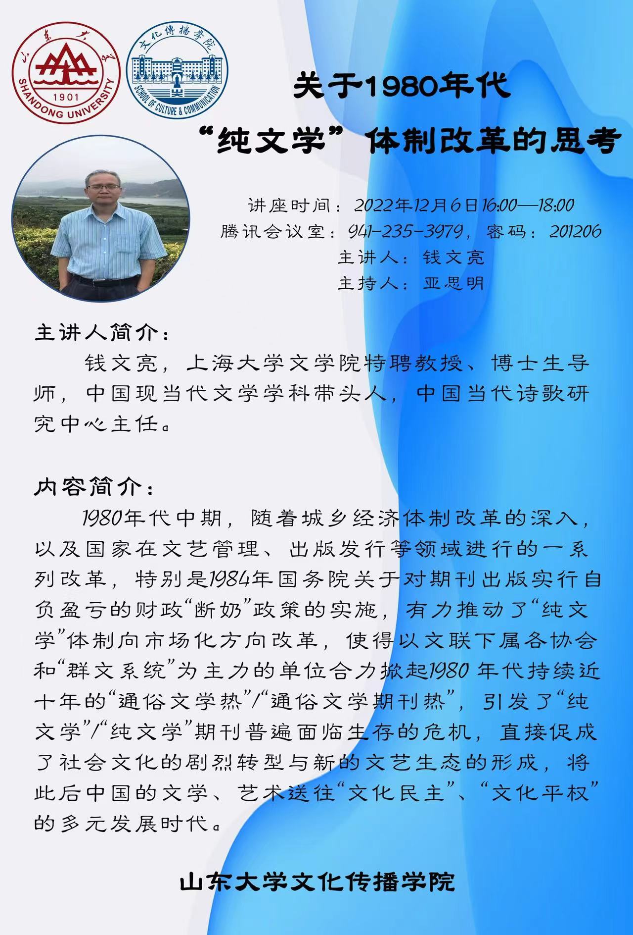 钱文亮,上海大学文学院特聘教授、博士生导师,中国现当代文学学科带头人,中国当代诗歌研究中心主任。1985年本科毕业,1992年硕士毕业,后师从著名文学史家洪子诚先生并于2003年获北大文学博士学位。2014—2015年为美国威斯康星大学高级访问学者。曾先后参与创办《通俗文学评论》、《网络文学》等杂志,兼任北京大学新诗研究所研究员、上海市市民诗歌节学术嘉宾、《诗收获》杂志编委等。从事诗歌写作与诗歌评论、文学研究逾四十年,迄今已有数十篇论文被人大复印资料、《新华文摘》、《中国新诗年鉴》等全文转载。曾主编过《老玩具•老游戏》和《中国百年新诗大典》(第二十二卷)、《中外名诗读本》等书。出版有专著《新文学运动方式的转变》和《诗神的缺席与在场》等。
