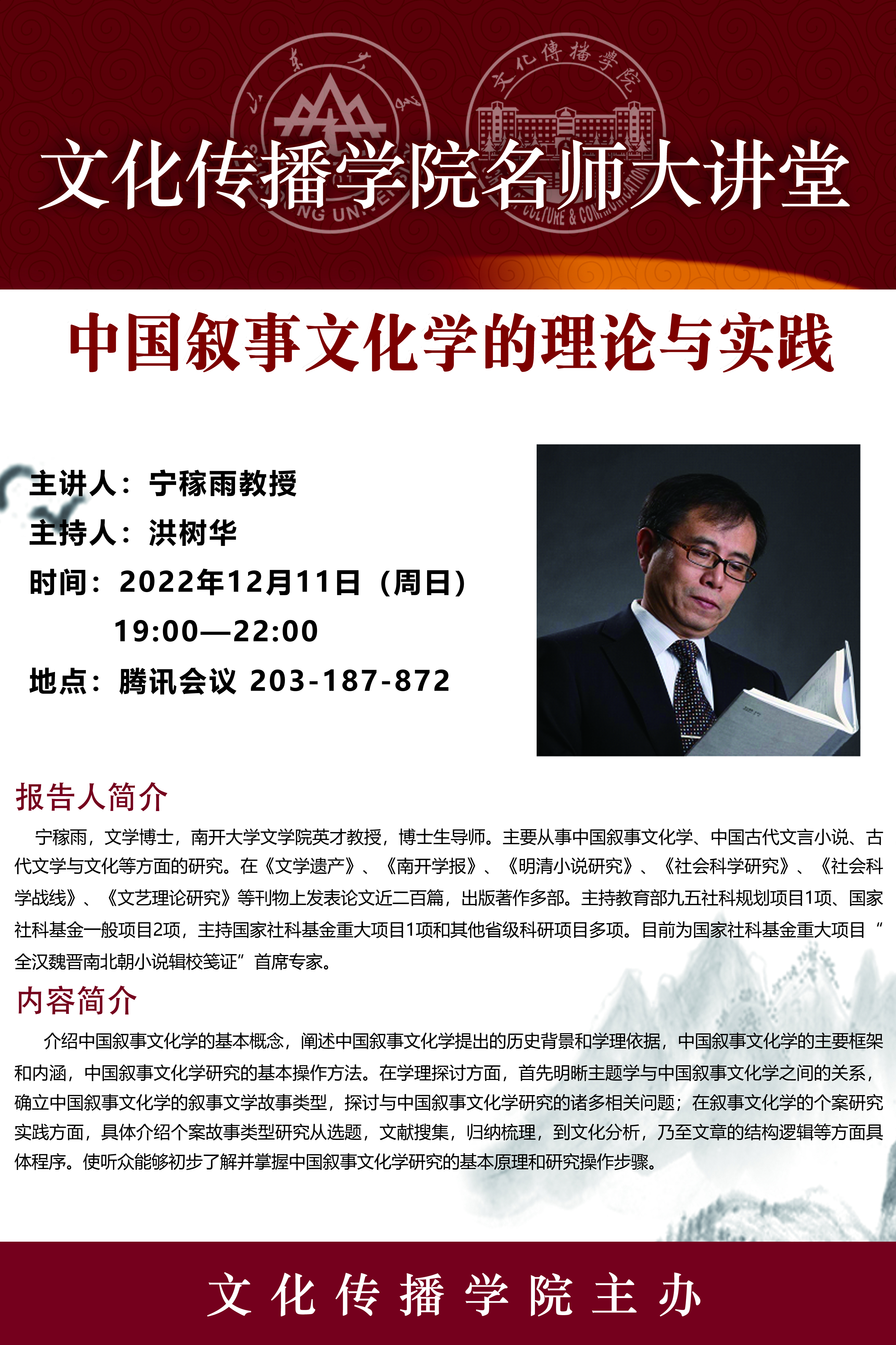 介绍中国叙事文化学的基本概念,阐述中国叙事文化学提出的历史背景和学理依据,中国叙事文化学的主要框架和内涵,中国叙事文化学研究的基本操作方法。在学理探讨方面,首先明晰主题学与中国叙事文化学之间的关系,确立中国叙事文化学的叙事文学故事类型,探讨与中国叙事文化学研究的诸多相关问题;在叙事文化学的个案研究实践方面,具体介绍个案故事类型研究从选题,文献搜集,归纳梳理,到文化分析,乃至文章的结构逻辑等方面具体程序。使听众能够初步了解并掌握中国叙事文化学研究的基本原理和研究操作步骤。