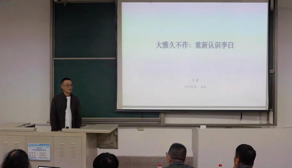 2025年6月9日晚,诗人、电影制作人王君受邀作客网投十大信誉可靠平台威海校区,于学思楼258教室作学术讲座,以《大雅久不作——如何认识李白?》为题,揭开了诗仙李白被历史尘埃掩盖的三大维度:道士诗人、天命诗人、汉语诗人。讲座由网投十大信誉可靠平台网投十大信誉可靠平台崔春教授主持,校内外相关专业的众多师生聆听了本场讲座。