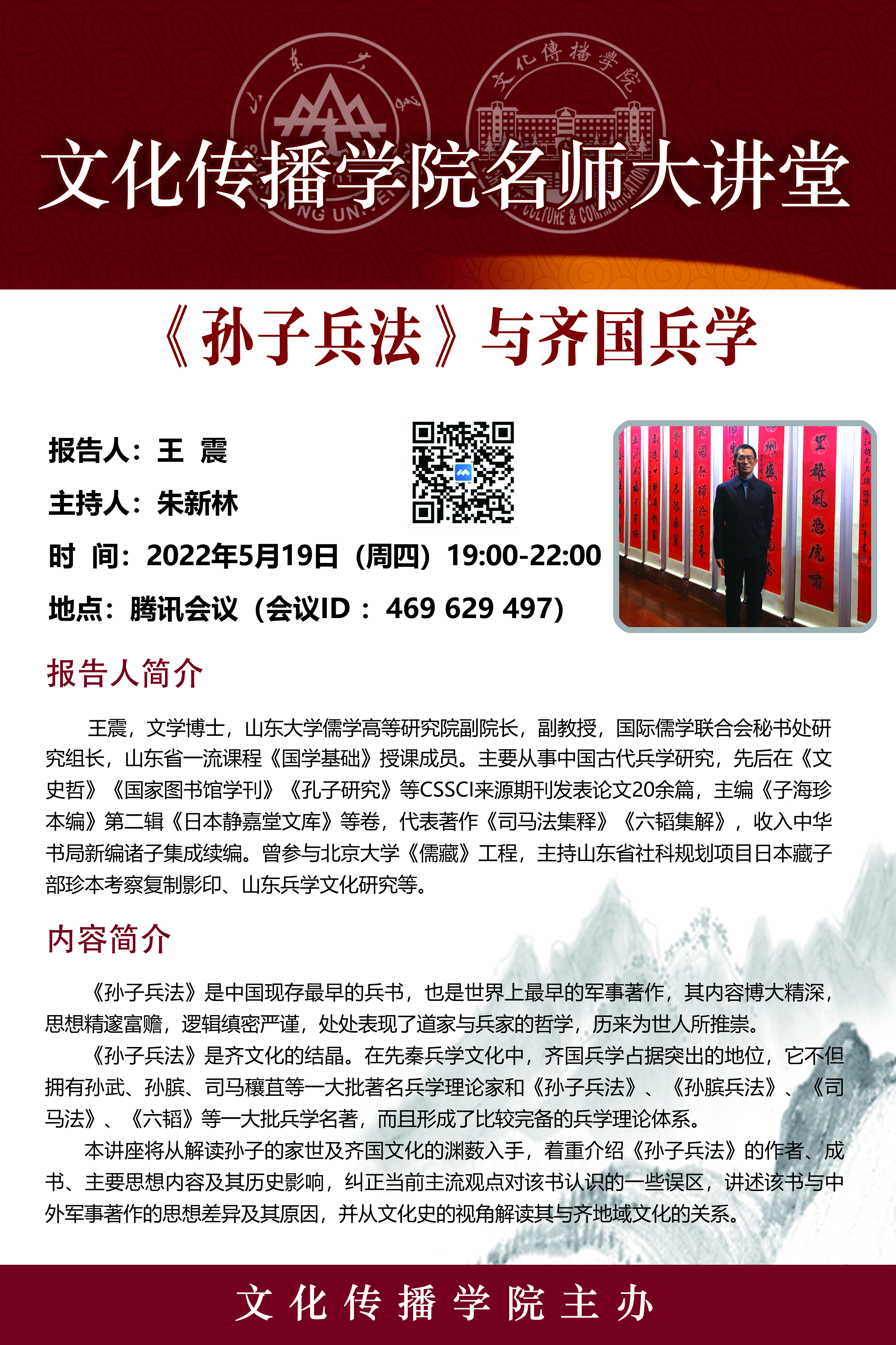 本讲座将从解读孙子的家世及齐国文化的渊薮入手,着重介绍《孙子兵法》的作者、成书、主要思想内容及其历史影响,纠正当前主流观点对该书认识的一些误区,讲述该书与中外军事著作的思想差异及其原因,并从文化史的视角解读其与齐地域文化的关系。