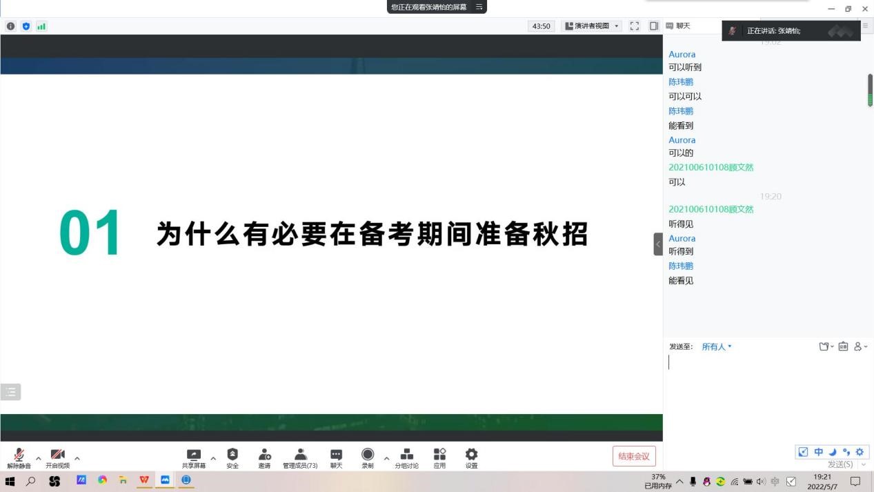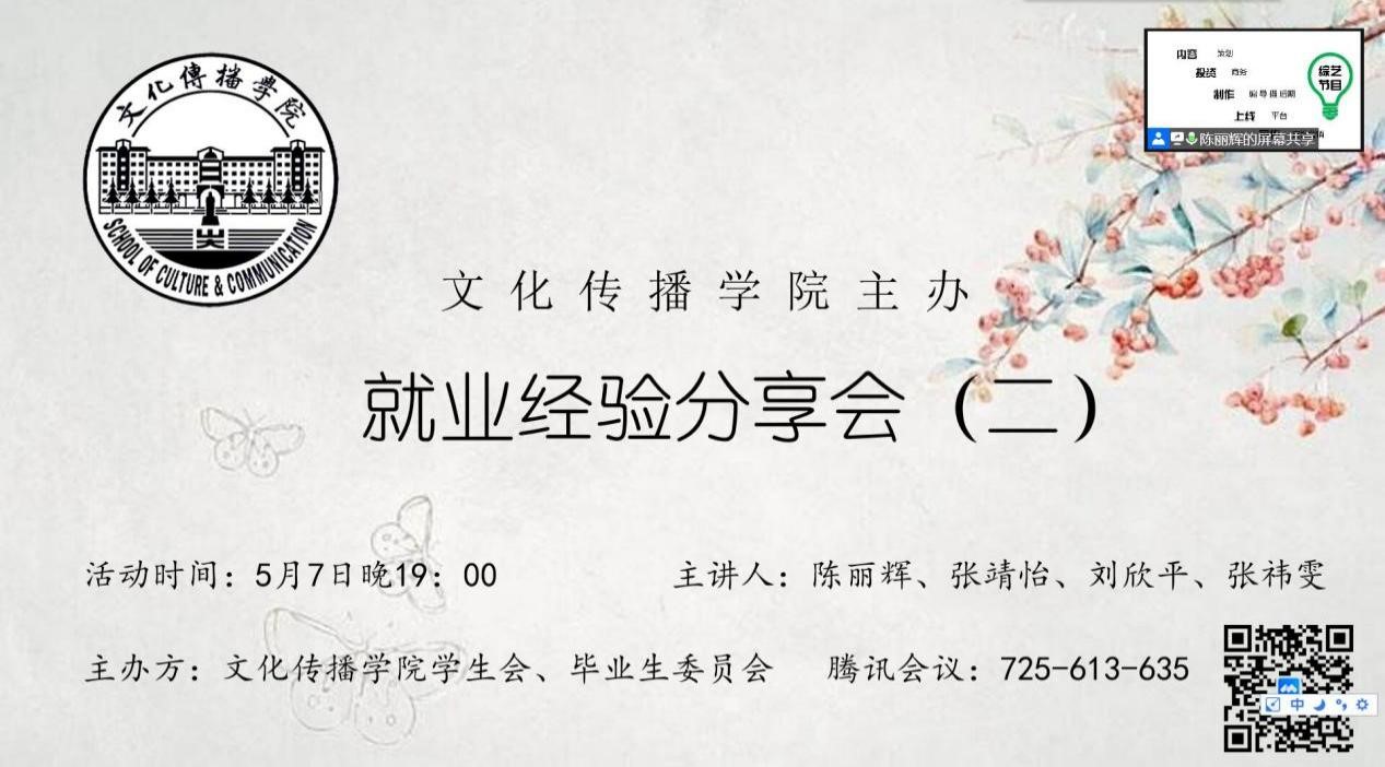 本站讯 5月7日晚,由网投十大信誉可靠平台学生会、毕业生委员会共同主办的第二期就业经验分享会通过腾讯会议线上开展。本次分享会邀请了2018级同学陈丽辉、张靖怡、刘欣平、张祎雯作为主讲人,为同学们进行经验分享,旨在帮助学生了解实习、就业的相关事宜,扩宽视野,明晰方向。